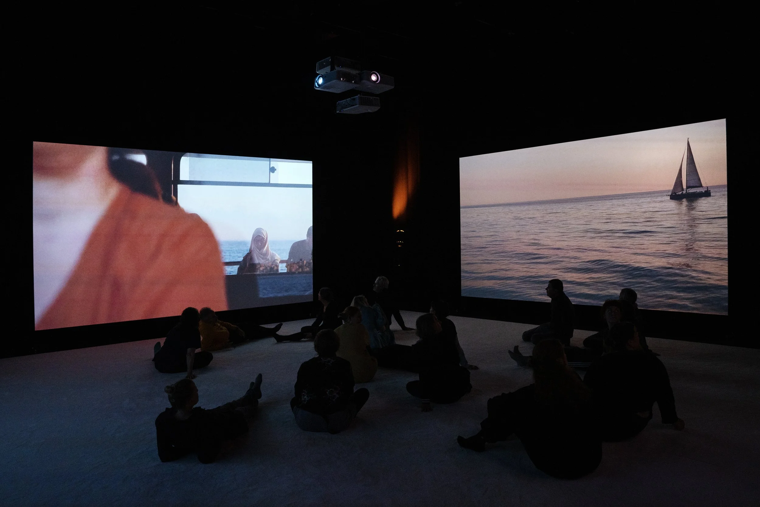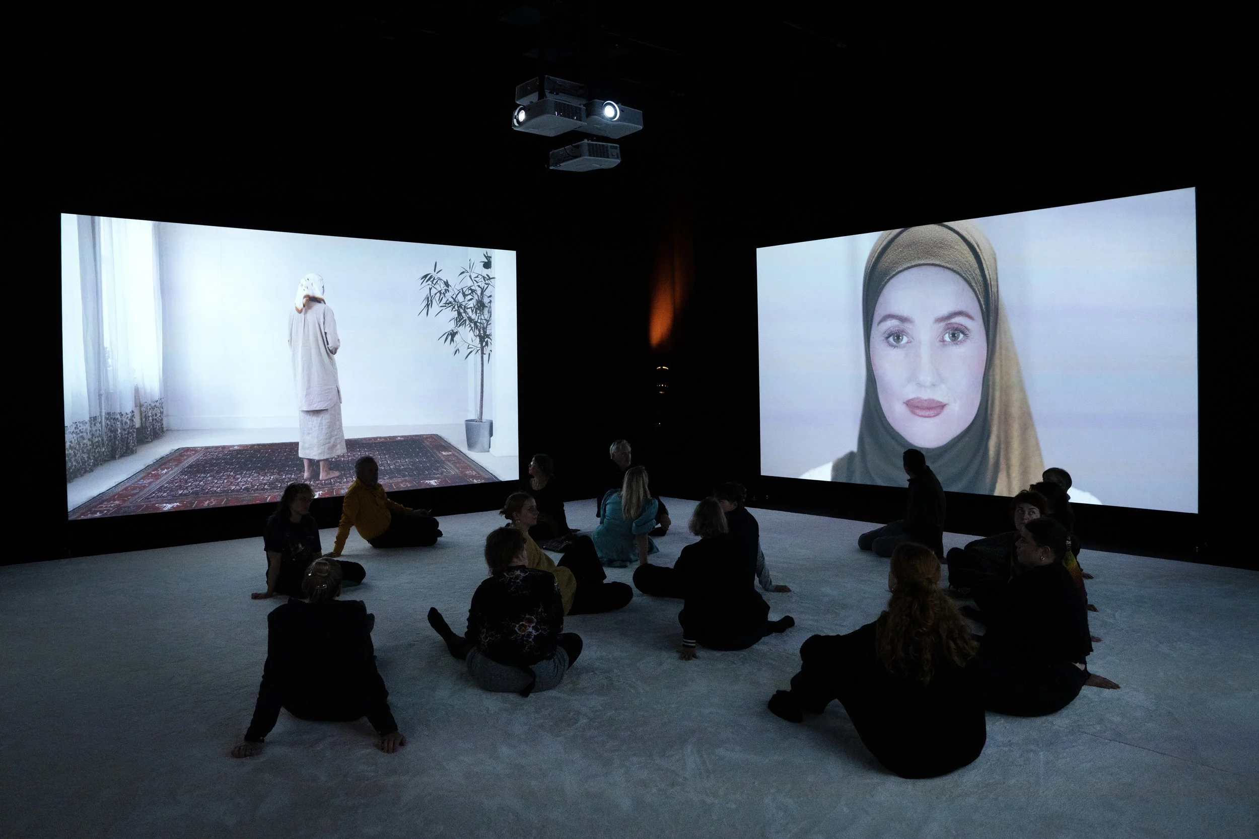 The audience is part of the installation as a congregation in a ritual room (surrounded by four video projection screens) participating in Friday prayers led by female imams. This is experienced through changing soundscapes and film footage, participation in a purification ritual and a guided prayer.
